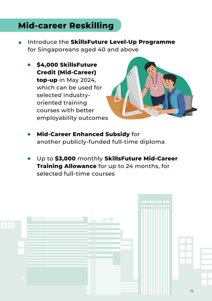 Now, a new SkillsFuture Level-Up Programme will be introduced with a focus on supporting mid-career workers. This comprises a S$4,000 top-up in SkillsFuture credit top-up in May 2024 for Singaporeans aged 40 and above. This applies to those who want to upskill in “selected training programmes to improve their employability”.